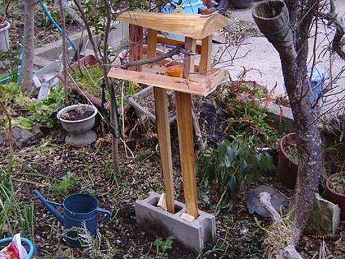 くもり/池作りがすんだので先日作った餌台の設置を始める。土台もヒノキや杉の切れ端で作ったので形に合わせて作業をする。土を少しだけ掘ってブロックを置いて、その中に杭を打つ。一本だけにしようかと思ったけど、餌台がでかいので二本使ってみた。杭を打…