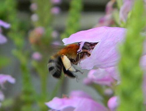 くもり/カクトラノオが綺麗に咲いています。シロスジコシブトハナバチがせっせと通っています。この長い口吻はこの花のためにあるのだな。きっと。^^