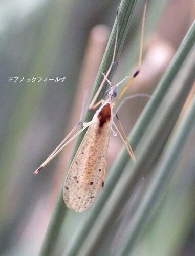 くもり一時雨のち晴れ/初めて見る小さめのガガンボです。背中が赤く翅は星模様、パステルカラーで特徴がありますが名前がわかりません。 体もオレンジ色ぽいので横から激写しようとしたら飛ばれてしまいました。